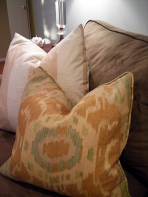 The wall with the sofa, the fireplace opposite of it, and the extra seating nook by the window are the main areas of our living room. My goal with this room was to keep it neutral but interesting, polished and neat but lived in and cozy. And so far, I think we’re getting there. One of the easiest ways to make a room feel cozy is with fabric. These Kravet ikat throw pillows are my favorite!