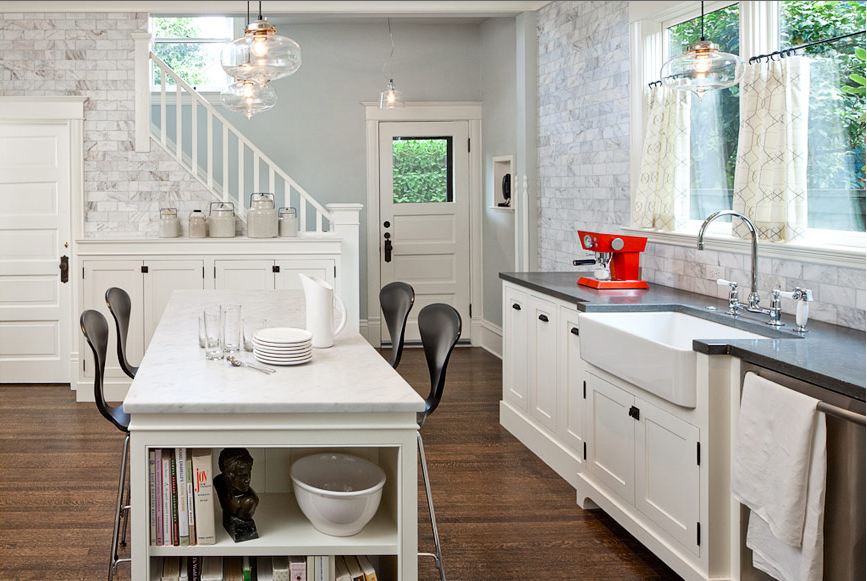 I don’t know what they are but I want them– the molds (?) on the shelf that look like rustic crowns. How charming for kitchen decor! Must add this to the kitchen design ideas file.