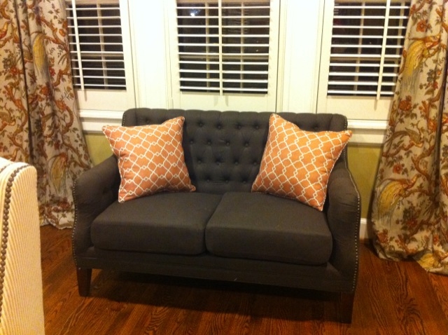 I purchased the most adorable linen tufted settee from a local shop here in Birmingham a few months ago to sit under window in our living room for additional seating space (we already have a large sofa and two chairs) but I had the space to add more seating and thought “why not?”.