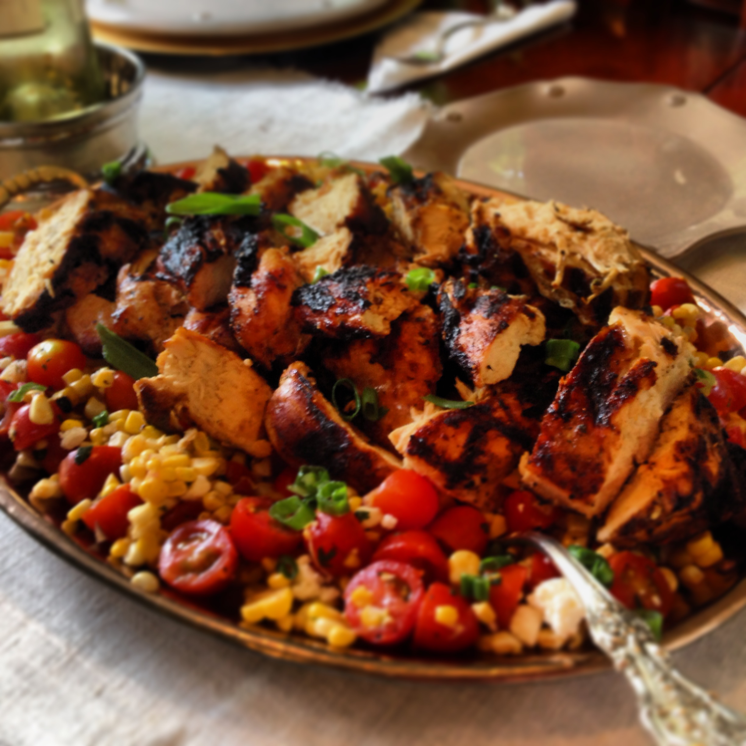I spread the corn & tomato salad onto a copper platter and then topped with the grilled chicken which I sliced. Then sprinkled a little green onion & feta and it was all set!!